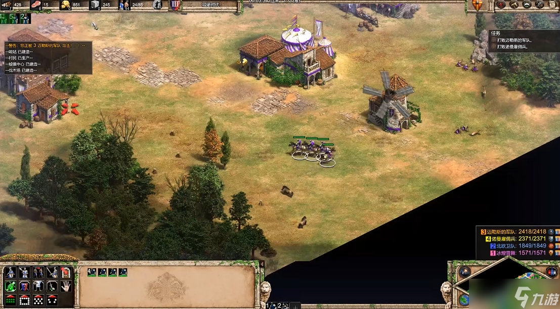 在后期决定性的推进与清剿阶段,若选择全灭敌人,则需注意拆除己方唯一的城堡以解除人口上限,但这一操作务必在确立绝对军事优势后进行。神圣罗马帝国的城镇防御相对薄弱,适合集中优势兵力逐个击破。清剿残余的迈勒斯军队和诺曼佣兵时,要特别注意兵种克制关系,针对诺曼佣兵生产的游侠,提前准备长戟兵作为前排,主力甲胄骑兵则负责正面突破。